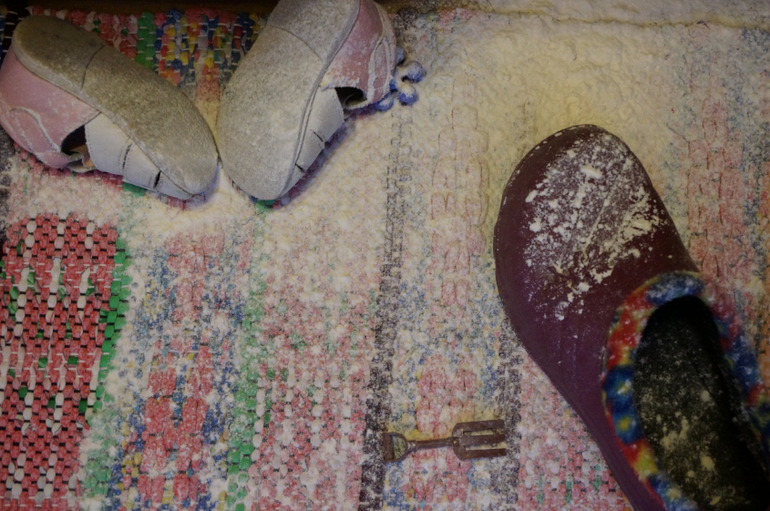 снег делают по-разному, но у нас был самый простой вариант — мука! мы не лепили снежков, просто все засыпали снегом, чистили дороги итд