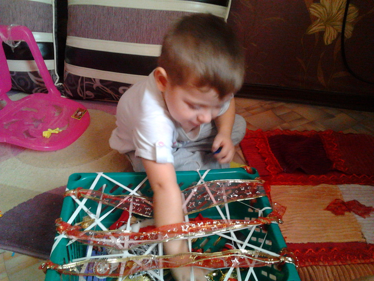 Доставать игрушки из такой "запутанной" корзиночки оказалось не так просто,(особенно крупные) но очень увлекательно.