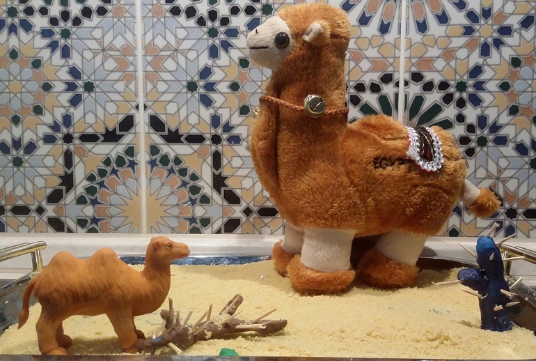 Насыпали "песка" на поднос и дули из трубочки, создавая песчаные бури. Наш Вася стойко переносил невзгоды. Вот повод рассказать об особенностях верблюдов, позволяющих выживать в самых трудных условиях.