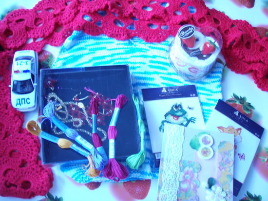 Натуля подарила нам всем огромное счастье, огромную радость! Со вчерашнего вечера хожу довольнущая, а Егор вообще даже спать улегся с новой машинкой))))))Ух тыж, сколько нам всего замечательного прислали!!! Чудесный самовязанный шарфик - моя мечта, Егорушке жилетку, а на пуговках мышки нарисованы - а он же у меня в год Мыши и родился!!!! Кофе и вкусняшки к нему (едим всем дружным семейством). Просто волшебная весення бижутерия! Наборчики мне для вышивания - обожаемая мной серия "Алиса". Ох! Сама себе завидую))))))))))) А полотенечко-то, полотенечко, свернутое как тортик! Я вчера его всем показывала - чуть ли не к соседям с ним бегала, такое аппетитное, хоть ешь его!