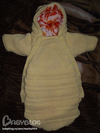 Крайне симпатично получилось и тепленько даже выглядит, а уж малышу там будет ой как уютно.  Пряжа у меня была Bambino (шерсть меринос - 35%, акрил - 65%) 50г/150м. Ушло 4-5 мотков, спицы №4