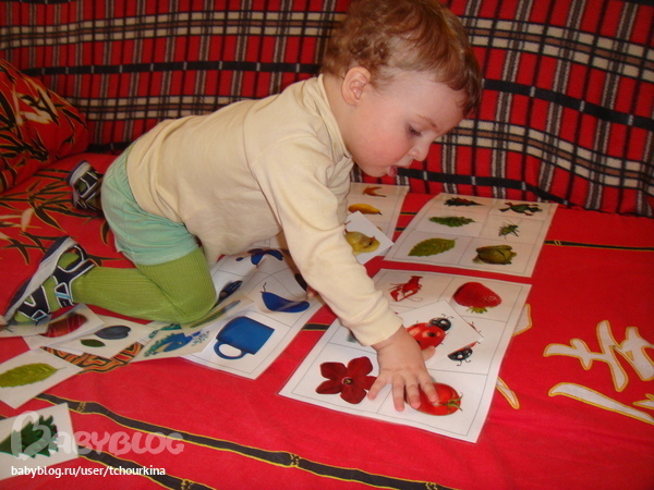 Первый раз Вова просто очень долго рассматривал все карточки (разрезанные), радостно узнавая знакомые предметы и изучая новые.