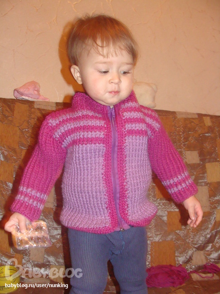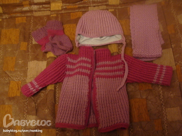 Больше всего мы пользовались шапкой: связана крючком резинкой, подклад из флиса. Кофту носили в морозы -20- очень теплая и "кондовая" получилась, как скафандр) А шарф и носки носили мало.