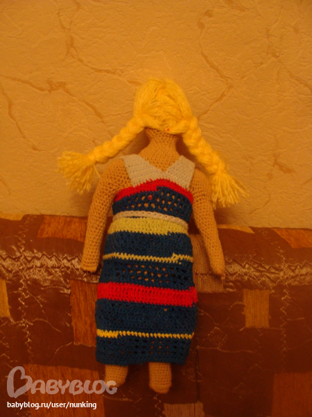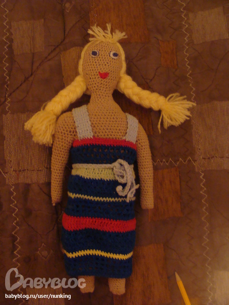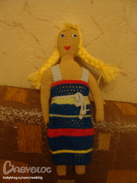 Куклу задумала и взялась вязать год назад. Начиталась всяких описаний и связала без каких-то определенных схем. Начала делать ей волосы по одному описанию, у меня дело не пошло и кукла год просто так провалялась стремя волосинками. Но тут я взяла себя в руки, переделала шевелюру, закончила сарафан и вот что вышло