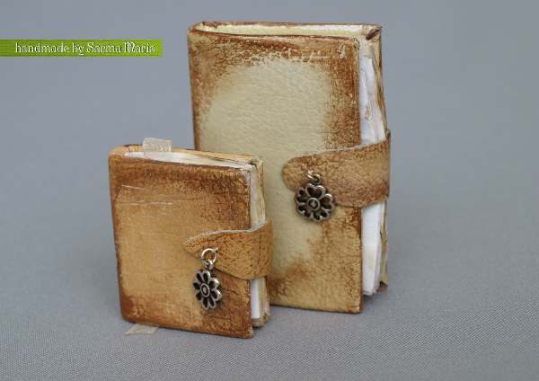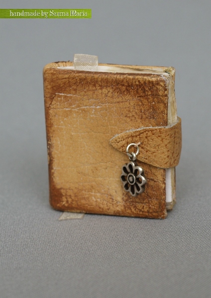 Маленькая книжечка из натуральной кожи. Всего 3 см величиной. Кожа состарена акриловыми красками, листочки чаем.