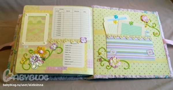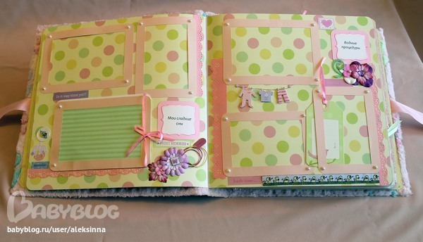 Обложку украшать не стала, только розовый мишка на переплете. Формат 30х30, 12 разворотов, вмещает 71 фото, теги для записи, .Есть дополнительный карман для фоток и карман для диска. Имеются таблицы роста и веса, зубок и успехов малышки.