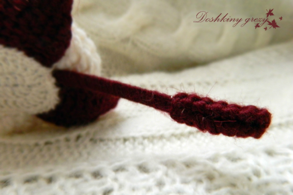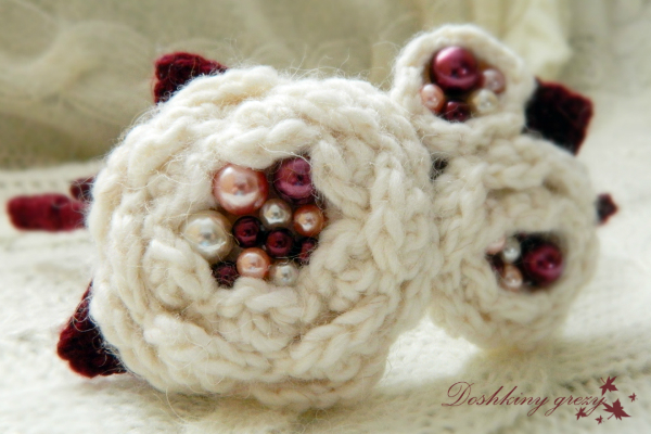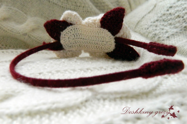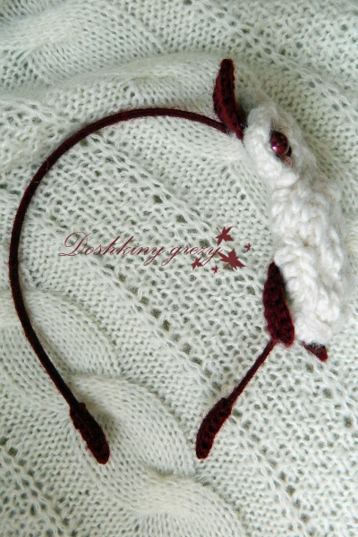 Да в общем то как такового МК нет. Розочку вязала как вот тут, только три центральных самых маленьких лепестка не провязывала (это место для бусин). А потом еще прошлась по кромке лепестков тонким крючком, провязывая на самых больших лепестках 6 петель на каждом, те что поменьше - 5 и самые маленькие по 4. Средний цветок, вяжется как большой, но без последнего ряда лепестков. Маленький - это только ряд самых маленьких лепестков. Это что касается розочек. Листочки на глазок вязала. Ободок просто обмотала нитью и на края связала наконечники (прямоугольник, сложенный пополам и зашитый по типу мешочка). Потом цветки и листочки собрала, далее пришила к ободку и прикрыла все это сверху овалом, который вяжется как стопа в пинетках)