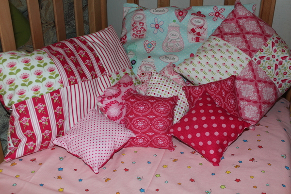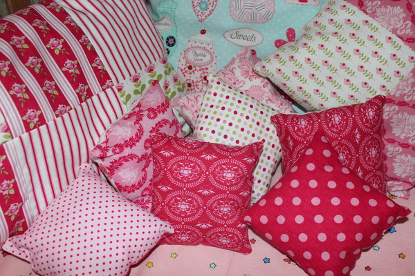 Подушки и подушечки сшиты из кусочков для пэчворка (использовано 36 кусочков - большие подушечки с обратной стороны - с другими рисунками и мотивами):