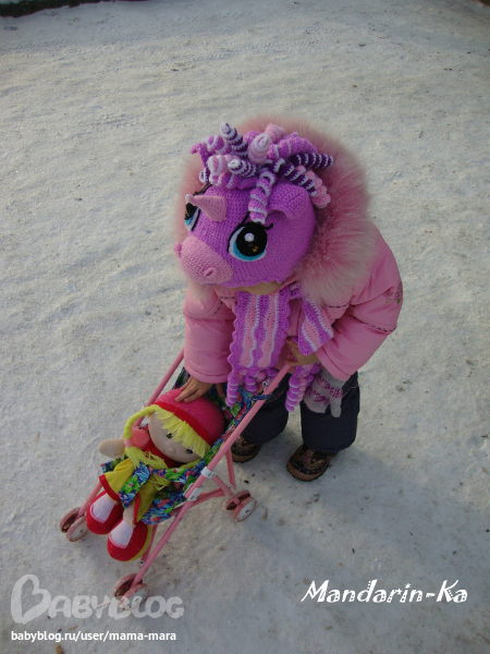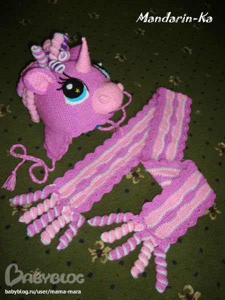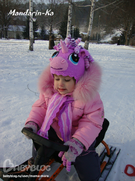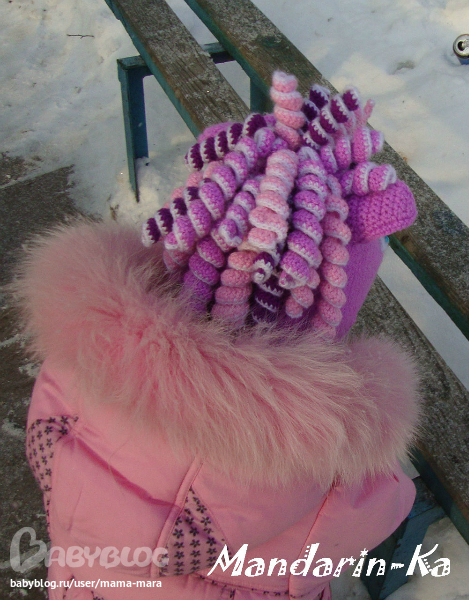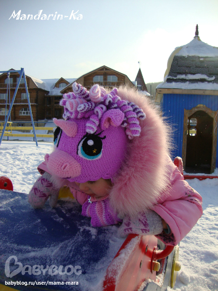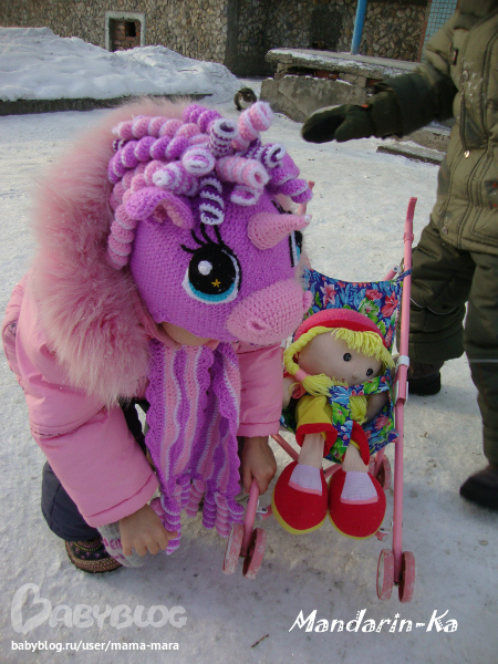Захотелось порадовать свою доченьку обновкой, придумала вот такую шапочку (моя авторская работа), а вдохновили меня многочисленные игрушки лошадок пони. Дочка в восторге от весюлек на гриве и шарфике. Шапочка тёплая на подкладе из флиса.