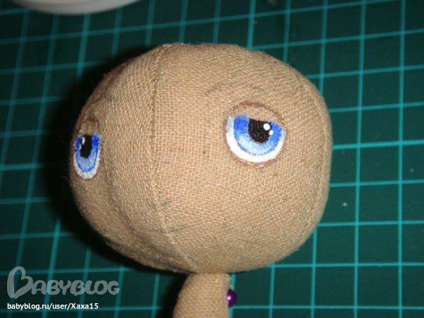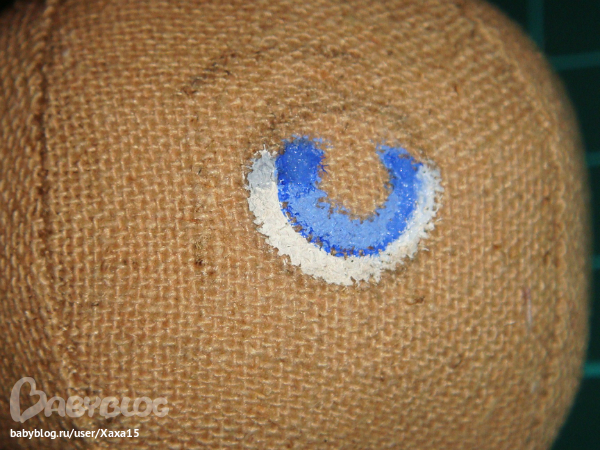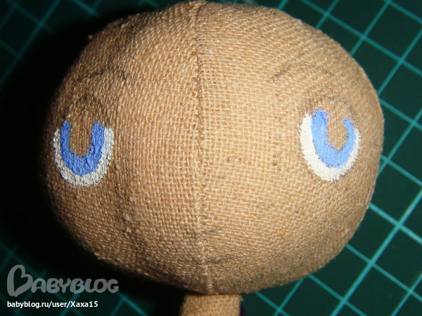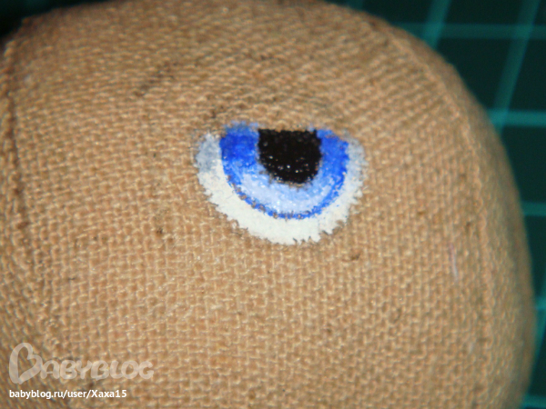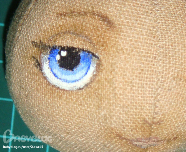 Я поочерёдно повторяю все мазки на каждом глазике для одинаковости последних:) Одна важная тонкость: можно исправить любые огрехи, которые нечаянно допустили внутри линии глаз! Вся область внешняя, должна оставаться чистой!!! Затем рисуем радужку: у нас синий цвет глазок, поэтому берем на кисть синюю краску и рисуем второй ободок ближе к центру...