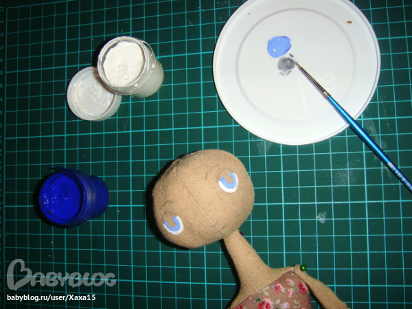 Выбираем основной цвет глаз (допустим, синий)... Акриловые краски быстро сохнут, поэтому пользуемся палитрой, куда накладываем немного краски трёх основных цветов (синий (в данном случае), черный и белый).. Рисуем достаточно быстро! Под рукой должна быть вода для промывки кистей и ненужная тряпочка для быстрой обсушки кистей! Набираем на кисть нулёвку белой краски и рисуем белый ободок - белок глаза...
