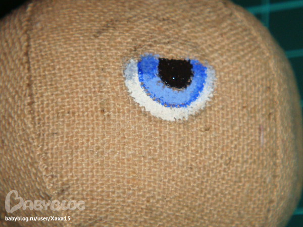 Никаких чётких линий, цвета переходят плавно, линии прерывиста!!! Пока краска не высохла, берем немножко белой краски и проходимся по всей синей радужке, избегая краёв, краски смешиваются и получается светло-голубой участок. Края должны быть темнее, для придания объёма!