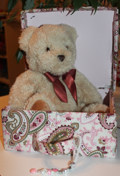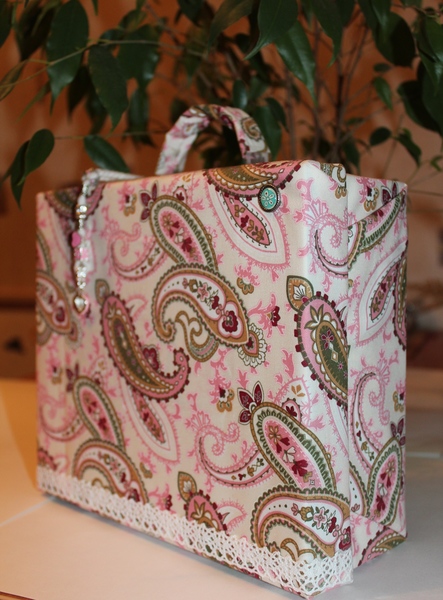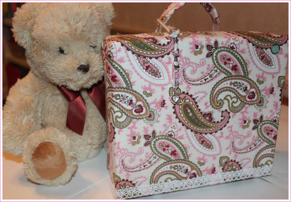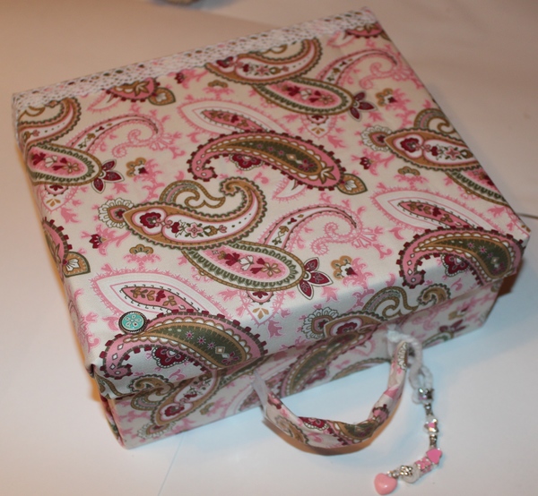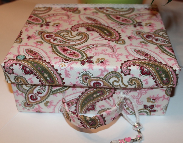 Основа - обыкновенная коробка из-под детской обуви. Сверху ткань, внутри бумага для скрапбукинга, ручка от другой коробки, подвеска из металических бусинок.