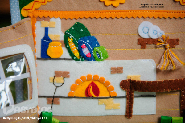 Домик застёгивается на магнитную кнопку. деда и бабку можно сажать за столик, на печке живёт мышка.