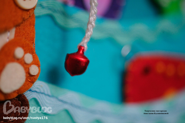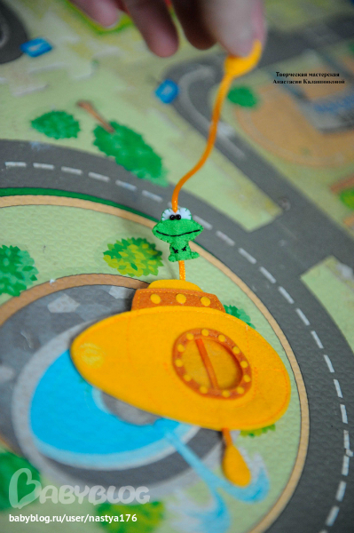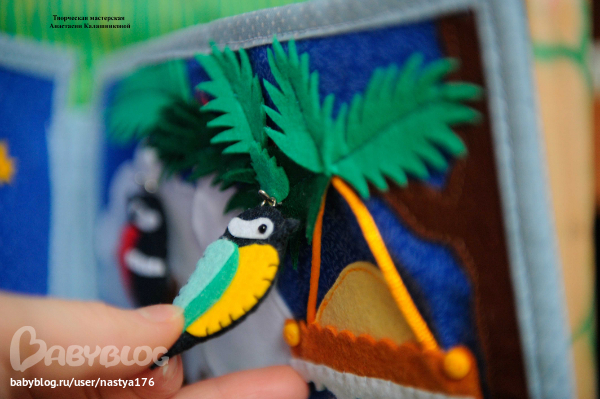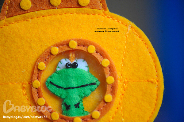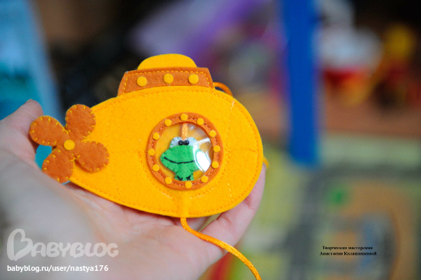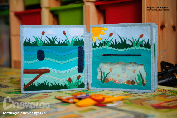 А в глубинах речки плывёт отважный лягушонок в своей подводной лодке. Учимся расстёгивать молнию. Потянув за веревочку из лодки вылезает лягушечка)) На дне речки лежат ракушки и камушки. Винт на липучке)