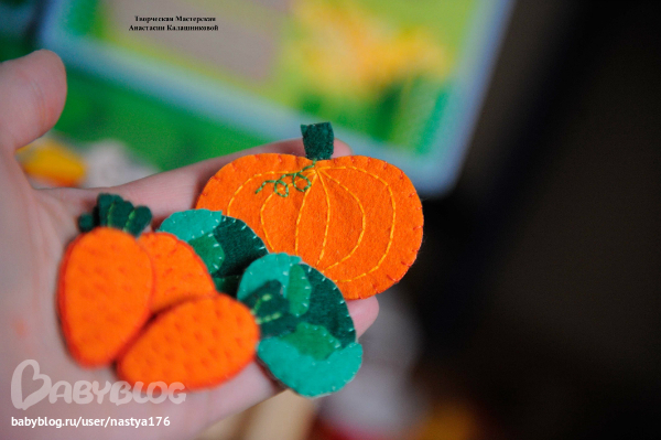 на грядках растут овощи: Одна тыква, Две капусты, ТРИ морковки. учим счет до трех и сравниваем овощи по размеру - учим понятия "большой, средний, маленький". Овощи на липучках.