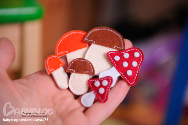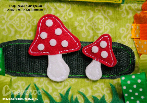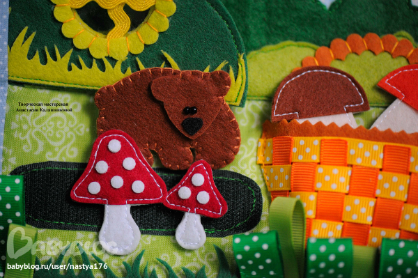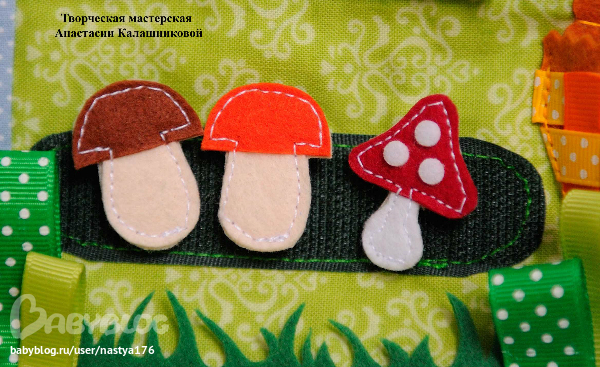 А в берлоге живёт Мишка) Берлога на липучке. Он любит собирать грибы!!!! Сортируем грибы: только большие. только маленькие, только съедобные, только ядовитые, по цветам))))