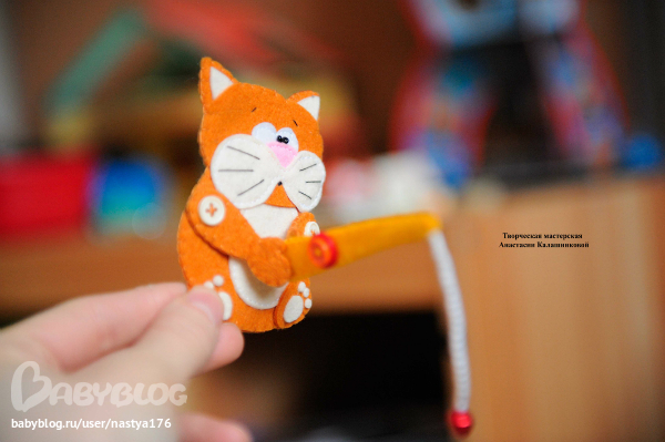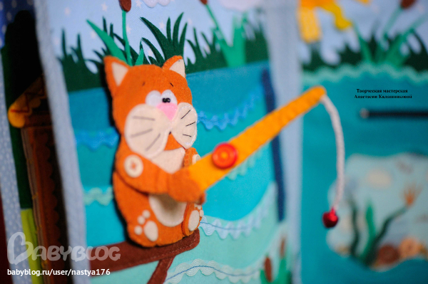 Ловим рыбку вместе с котиком. Сравниваем удочки "большая - маленькая". У котика на лапках липучки, чтобы мог сам держать удочку) На конце маленькой удочки - бубенчик, а на конце большой - магнитик.