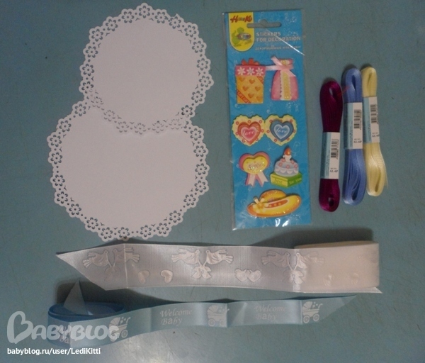 Наклейки, атласные ленты 5м., вырубка круглая, круги разного диаметра, каждой вырубки по 5 кругов и ленты "Свадебная" и "Детская".