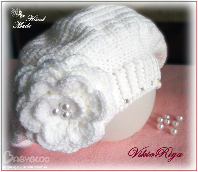 Какая-то мания пошла на эти беретки)))Все хотят своим красоткам большие цветы на голове)))Будут ходить маленькие крошки и цвести всю весну)))Вот связалась очередная беретка,только в белом цвете