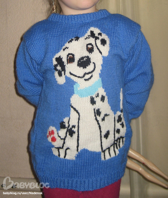 Не могу не похвалиться - вчера закончила свитерок для дочки с заказанной собачкой. Для меня тут два повода для гордости - первая удачная "взрослая" горловина и первая удачная собственная схема рисунка (собачки то есть).