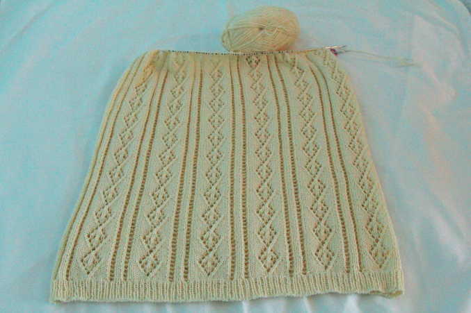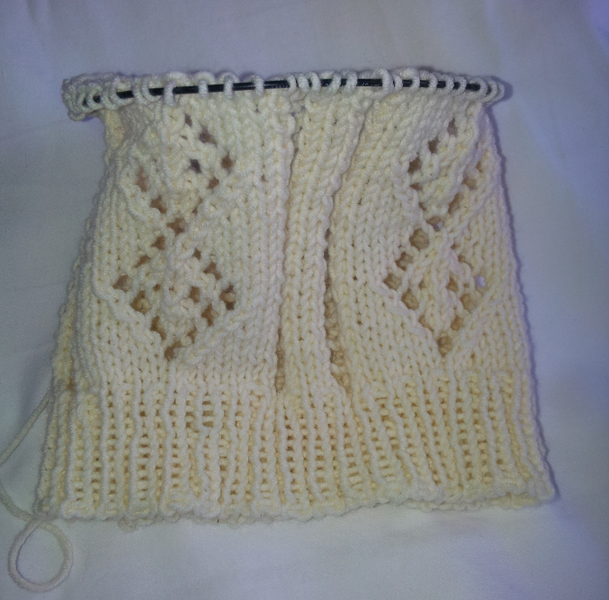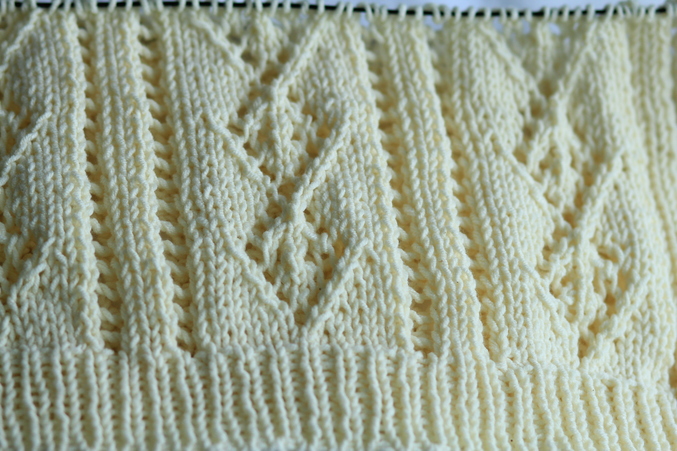 Набрать 71 петлю при помощи "косички" на спицы №2,5 и провязать резинкой 1х1 10 рядов. Далее вязать основным узором начиная и заканчивая схемой с двумя накидами. Всего 10 раппопортов.