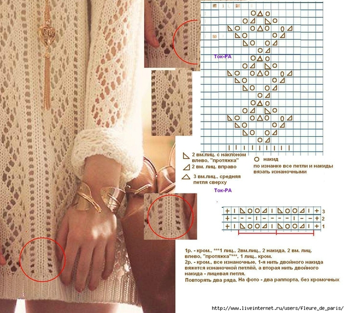 Адаптировала схему под круговое вязание!!!! Для этого в схеме с двойным накидом сначала вяжу две петли вместе протяжкой, потом двойной накид, а потом просто две вместе лицевой. В след. ряду первый накид провязываю изнаночной, а второй лицевой петлей. Получаются очень красивые квадратные дырочки. Схему ромбов оставила без изменений. В этой схеме "изнаночные ряды" вяжу лицевыми петлями.