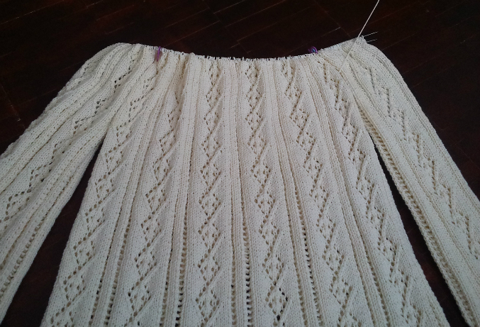 Соединяем рукава и тушку, и начинаем вывязывать линии реглана