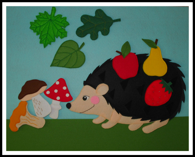 Давно уже заметила что сыну нравится ежик на странице моей развивающей книги. Постоянно открывает эту страничку, срывает с ежика грибочки и разбрасывает по всему дому)) Решила сшить ежика побольше и ассортимент еды расширился: белый гриб, мухамор, лисичка, кленовый лист, дубовый, осиновый(?), клубника, яблоко и груша.