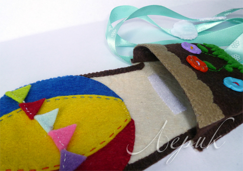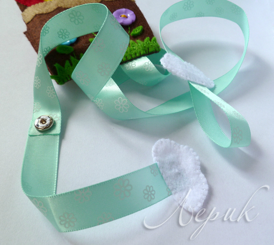 Кармашек (корзина воздушного шара) на липучке. На одной ленте просто петля для ободков, на второй - петля на кнопке для больших резинок.
