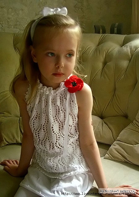 Белый ажурный топ Пряжа турецкий хлопк Suny 400м на 100гр., спицы №3, №4. Размер: 5-6лет. Вяжется топ из двух деталей снизу вверх. Для каждой детали спицами №4 набрать 75п. и вязать ажурным узором. Вверх повторить раппорт 7раз. Связав 2 детали не закрывая петель, собрать на круговые спицы №3 и вязать по кругу верхнюю кайму из дырочек: 2 ряда изнан. гладью, в след. лицевом:1кром, 2вм. лиц., накид...и т.д.,1кром, затем 2 ряда изнан. глади. Все петли закрыть. Сшить боковые швы до нужной высоты проймы. Верхний и нижний край обвязать крючком 1р. ст.б.н, и 1р. пико. Втянуть ленточку. Для того, чтобы каждый раз не завязывать ленту можно в верхней кайме провязать больше изн. рядов и сшить её, получится что-то типа кулиски и внтрь втянуть резинку. Бантик или цветок просто пришить.