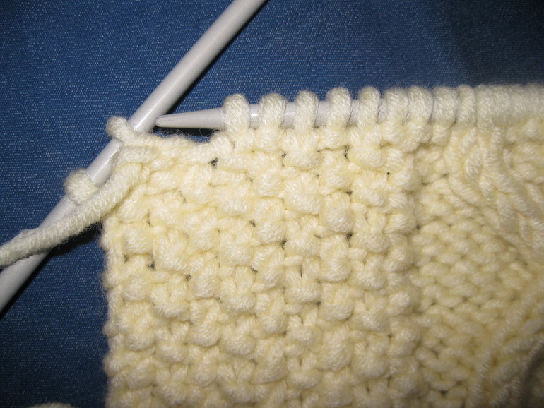 Спинка и полочки - вязать буду одной деталью - набираем 112 петель ( я примеряю к пиджаку сына ) .Все ряды заканчивать лиц. п. Первые четыре ряда провязать жемчужным узором . Продолжить , распределяя п. след. образом - 10 п. жемчуж. узором , 16п. фантазийным ,22п. жемчуж. узором , 16п. фантазийным ,22п. жемчуж. узором ,16п. фантазийным , 10п. жемчужным .Для прорезей для пуговиц в 5-ом ряду закрыть 2 предпоследние петли, а в 6-ом ряду над закрытыми петлями сделать 2 накида. Прорези повторять через каждые 7см нужное кол-во раз .