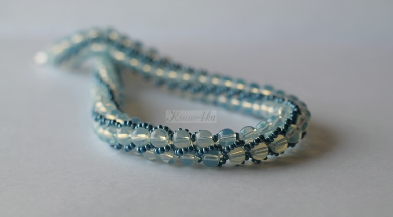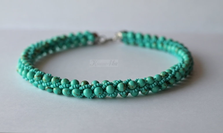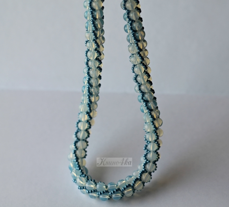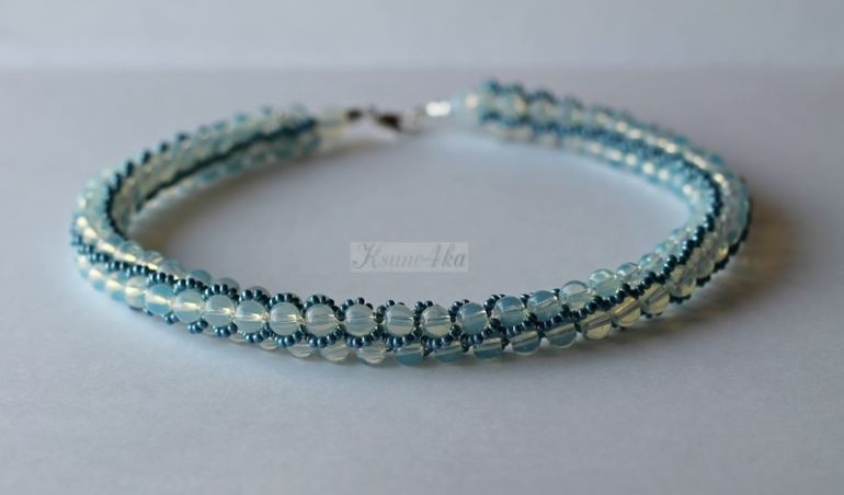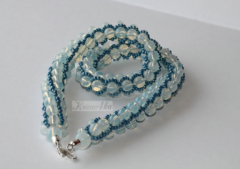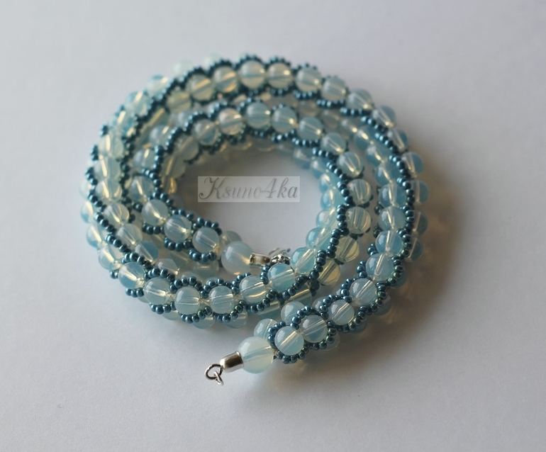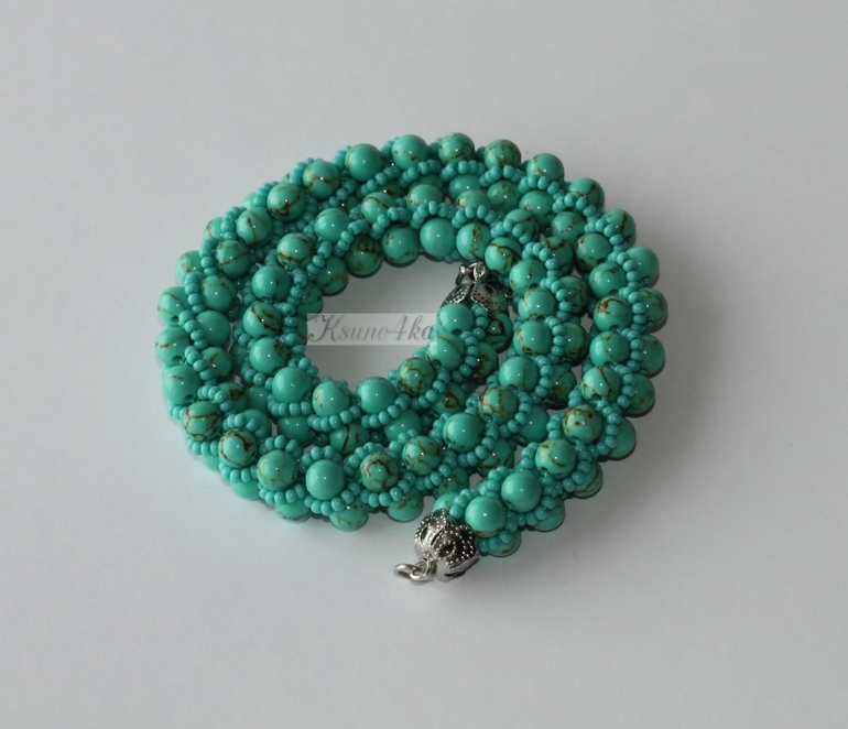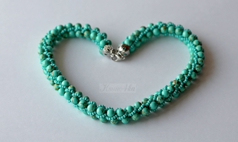 Колье связано из бусин лунного камня и чешского бисера красивого глянцевого тёмно-бирюзового цвета. Мне это сочетание так понравилось, что колье нанизалось и связалось всего за два часа! При том, что иногда петельки срывали с крючка и приходилось их ловить. А процесс этот просто ужасающе скоростной! Одна петля может запросто половину жгута распустить(((((( Да и процесс подхватывания петли не самый простой. Но я уже "стреляный воробей", приловчилась быстро находить убегающую петельку.