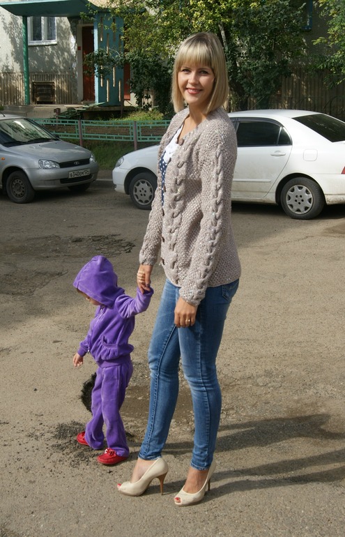 Пряжа Alize Sal abiye, хватило 5 моточков, вязала в 2 нити спицами 4, Планку и горловину обвязывала тройкой. Модель авторская, без описания, все из головы, собирала по частям )))))