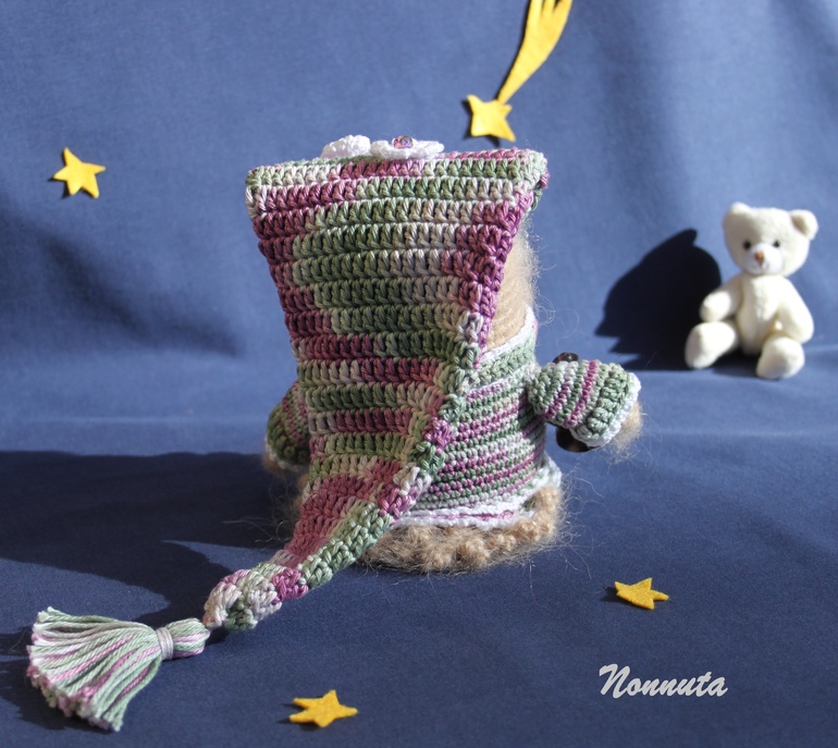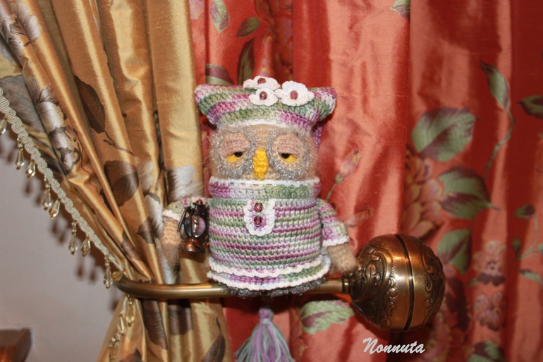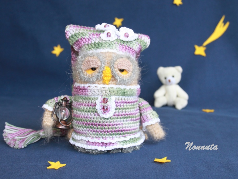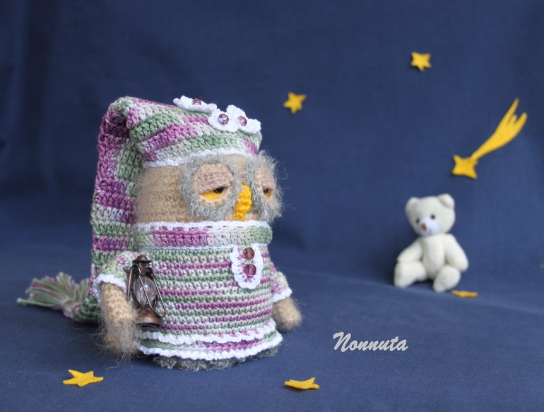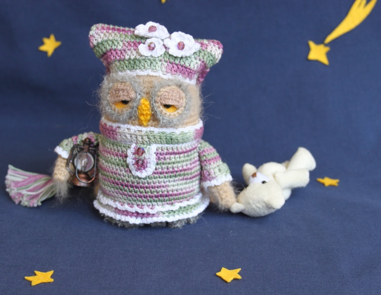 Для одного хорошего человека ***ЯИRадуга*** связалась в подарок совушка - хранительница снов. Она благополучно долетела до места назначения и с удовольствием принялась за свои обязанности. А это ни много ни мало: навести дремоту, а за ним и сладчайшие сны на всех членов семьи. А вы думаете это так просто?! Попробуй всех угомони! Но она любит свою работу и, если честно, готова выполнять ее и днем, и ночью, без оплаты сверхурочных;) Ну, вот такая уж трудяга!
