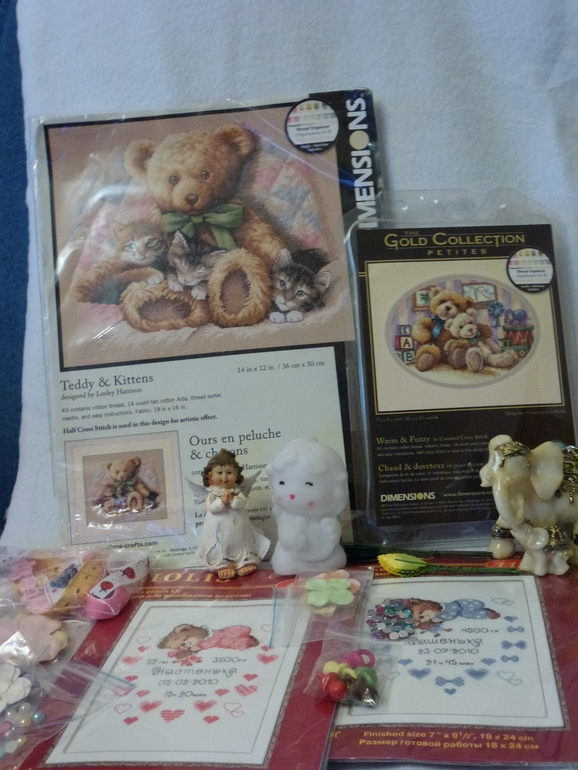4 набора для вышивки, ангелочек-светильник (дочка утащила себе), статуэтка-ангелок, слоники