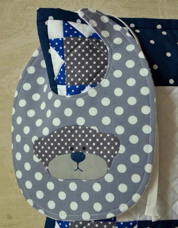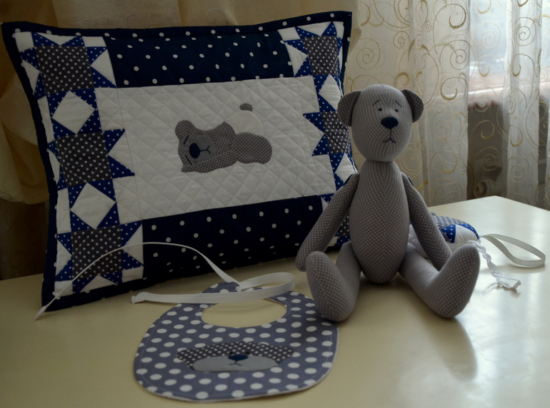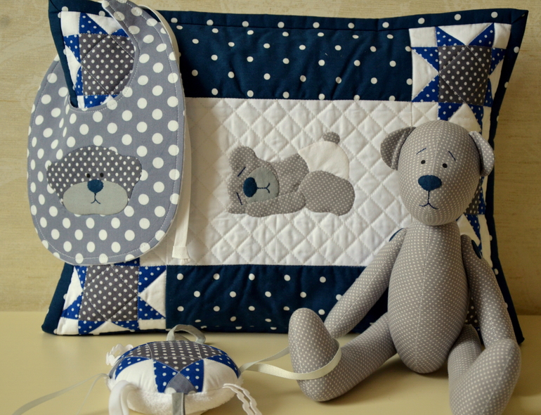 Комплект состоит из лоскутной подушечки с аппликацией (размер подушки 30х40 см), мишки и слюнявчика.