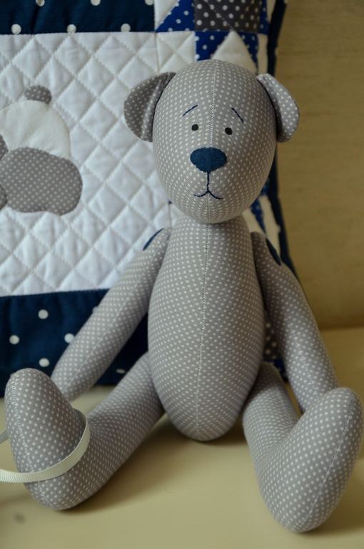 Алена, спасибо! Мишка — это аппликация с закрытыми срезами, пришитая вручную потайными швами.