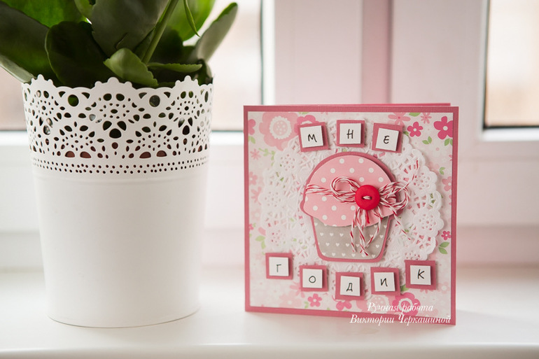 С капкейками пришлось повозиться, и вырезать их вручную по шаблону, найденному на просторах интернета. Каждая буковка тоже вырезалась ножничками, а потом была посажена на объемную клеевую подушечку (с маникюром пришлось тот час же распрощаться).