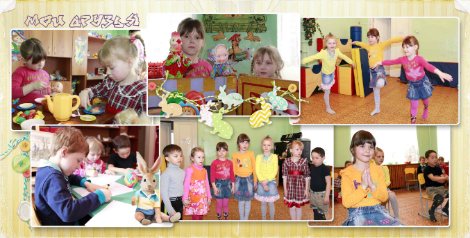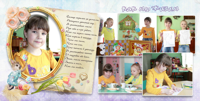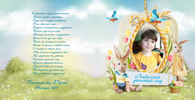 Здорово! я тоже сейчас в таком же стиле на выпуск группе делаю. мне нравятся зайчата и набор! где спортивные занятия совсем нет делаталей, элементов. а разворот "мои друзья" тень он зайчиков далеко на мой взгляд и падает на лицо ребенку (или поближе сделать тень или растушевать сильнее). возможно на титуле надпись "любимый детский сад" сместить с головы (верх рамки) к низу. Во втором развороте- стихи бы я чуть наклонила как бумажка и чуть угол бумажки поменьше сделала (если надпись там как будто написана) . а вы делаете всем детишкам индивидуальные или только для этой девочки??