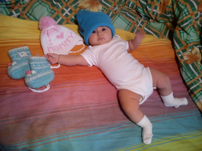 На мне темно-красные джинсы и кофта крупной вязки нежно-бирюзового цвета. В тон ей вязаные улины пинетки и моя шапка и перчатки. Красный и зеленый цвета в моем гардеробе примиряет яркий радужный полосатик.