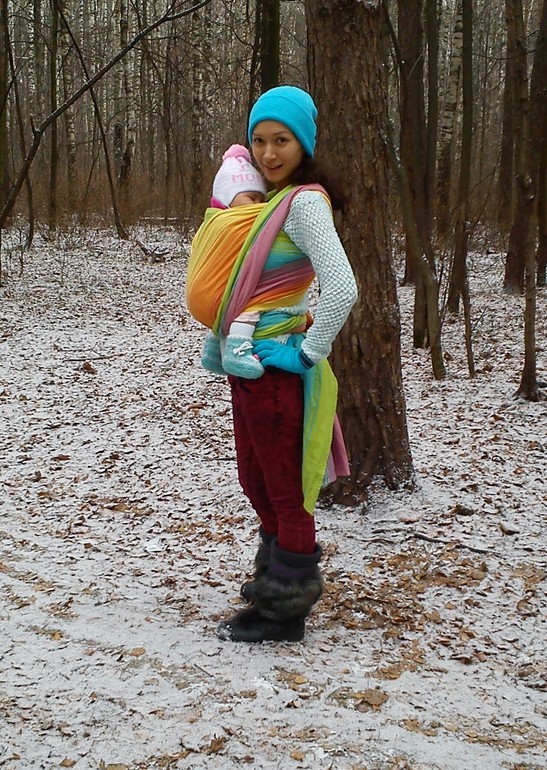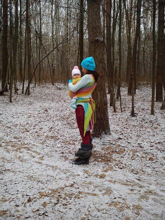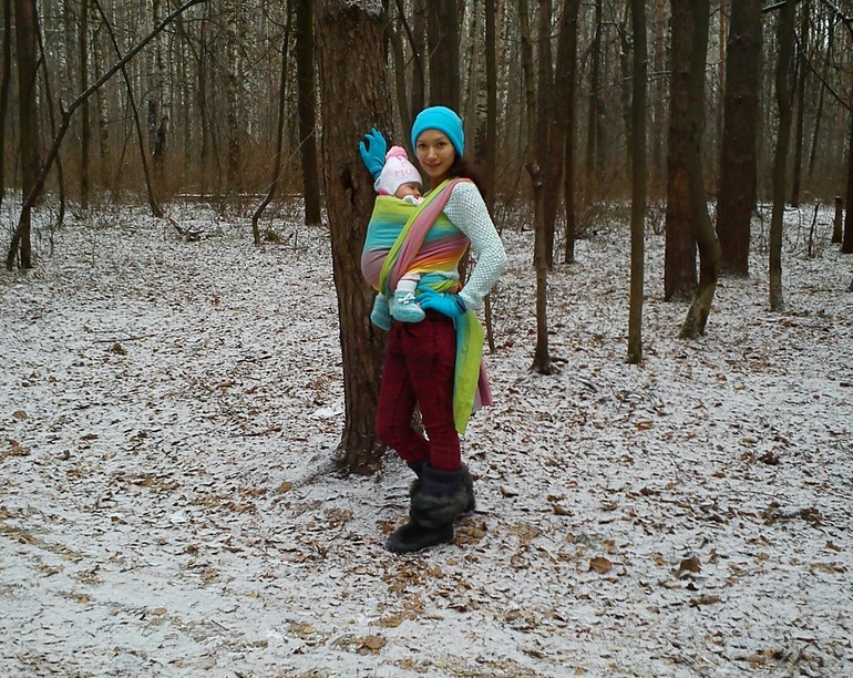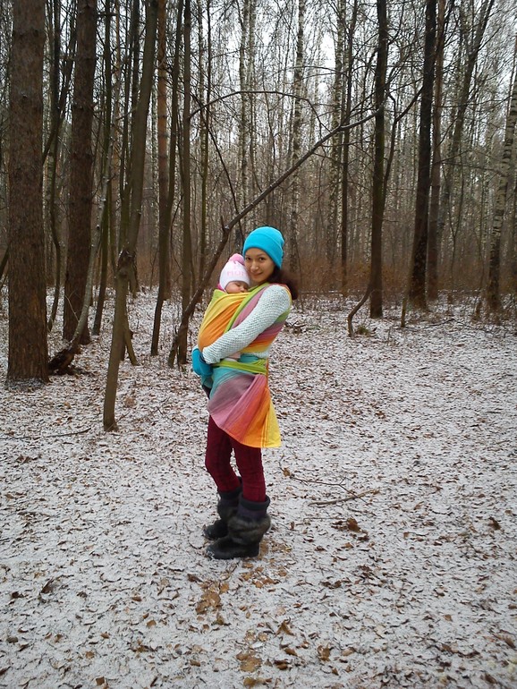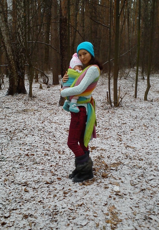 Этому Лягушонку я готова петь бесконечные дифирамбы. Он плотный, грузовозный, прекрасно подойдет для тоддлера, как мне думается. Ну и неходячую-несидячую тяжелую Улю в нем носить одно удовольствие. 8кг практически не чувствуются. Держит железобетонно на одном узле, при намотке не пытается никуда уползти- подтянул полотно, бросил...а оно так и держится! Для моей криворукости и дочиной шилопопистости это очень удобно В общем, держучий, цеплючий, а так же яркий и радостный- прекрасно поднимет настроение унылой осенью и холодной зимой. Единственный недостаток, на мой взгляд, так это то, что разнашивать его, вероятно, можно бесконечно...Несмотря на то, что я носила его довольно активно, на пребывание в гостях, где в нем носилась девонька постарше нас, Лягушачьей радуге все нипочем! Каким был практически таким и остался. Зато если разносить он станет идеалом))) Ну и не назвала бы я его экономно мотающимся. В КНК концы вперед у меня еле-еле выводятся.