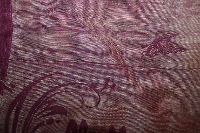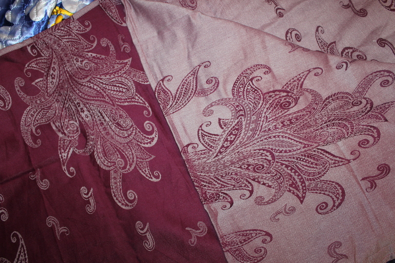 2) Ливада, 30% конопли и 70% хлопка, Бордовый хлопок и золотистая конопля. Прекрасный нежный паттерн. Не дерюжка))) На шарфике встречаются утолщения конопляной нити и в одном месте с изнанки есть вот такая полоса (из-за неровных нитей: то толще, то тоньше), с бордовой стороны не видно. На втором фото постаралась ее поймать. Цена 5500, *при оплате сегодня - 5000 руб.