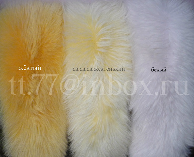 1) Песец - белый, чёрный, натуральный, шоколад с бордовым отливом, персиковый, св.розовый, розовый, розово- малиновый, красный, фиолетовый яркий, фиолетово-сиреневый, винная фуксия, синий яркий, жёлтый.