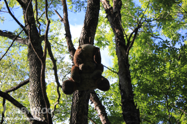 На обратном пути увидела большого медведя. Высоко на дереве. Кто и когда его туцда водрузил не известно.