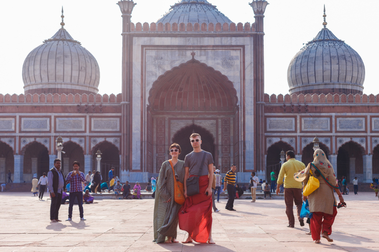 После мы отправились в район Old Delhi к очень красивой мечети Джама Масджид, поднялись, конечно, на минарет - мы ж везде залезем, где только можно))) Над мечетью величественно кружила стая соколов... мы впечатлилась! Ах да, нас на входе наряди в безразмерные халаты, чтоб прикрыть срамоту - шорты по колено))))