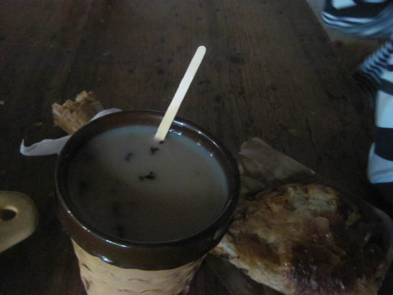 Мы ели суп из лосятины. Кстат, очень даже ничего, похож на борщ в "Теремке" Пирожки с яблоком и чай. Чай выглядел так: