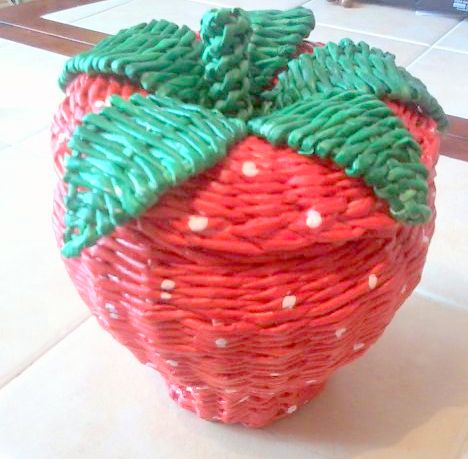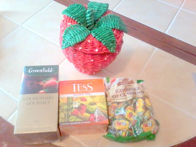 Плетеная шкатулочка-клубничка (внутри были спрятаны конфетки) сразу была назначена конфетницей, заняла почетное место на нашей кухне. Рядом с ней на фото вкуснющие клубничные чаи и конфетки "Клубника со сливками". Девочки, чай "Гринфилд Клубничный гурмэ" - это что-то необыкновенное! Со вкусом клубники и шоколада....ммммм.....!