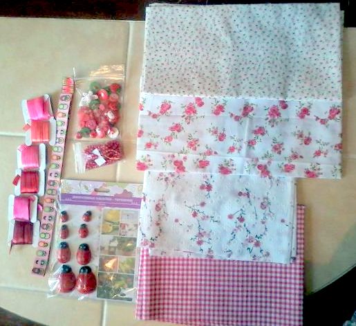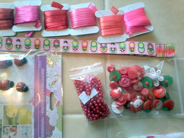 нежные красивущие тканюшки, божьи коровки, ленточки атласные и с матрешками, бусинки, пуговички всевозможные-невозможные! Всё в "клубничном" цвете!)))