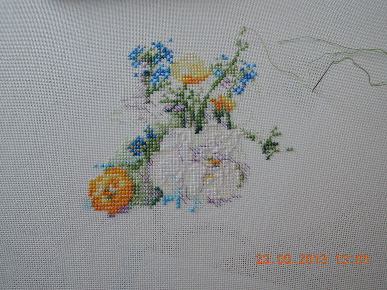 Сейчас вышиваю пионы с незабудками от Риолис, да больно тяжко они идут, канва заменена на равномерку. Вот что есть сейчас и планирую продолжать с большим энтузиазмом
